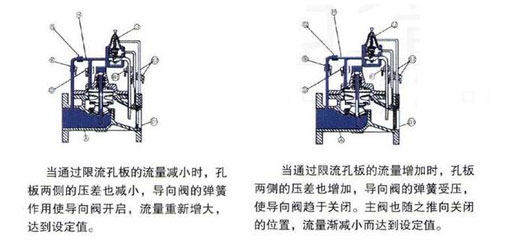 當(dāng)通過(guò)限流孔板的流量減小時(shí),孔板兩側(cè)的壓差也減小,導(dǎo)向閥的彈簧作用使用導(dǎo)向閥開(kāi)啟,流量重新增大,達(dá)到設(shè)定值。當(dāng)通過(guò)限流孔板的流量增加時(shí),孔板兩側(cè)的壓差也增加,導(dǎo)向閥的彈簧受壓,使用導(dǎo)向閥趨于關(guān)閉。主閥也隨之推向關(guān)閉的位置,流量漸減小而達(dá)到設(shè)定值。