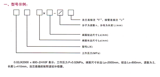 矩形波紋補(bǔ)償器型號(hào)寫法,舉例:0.02PJX2000*800-2/410F,表示:工作壓力P=0.02MPa,端面尺寸長(zhǎng)邊Lp=2000,短邊Ls=800mm,波數(shù)為2,長(zhǎng)度=410mm,法蘭連接的矩形波紋補(bǔ)償器。如果是接管連接的 后一個(gè)字母用J來表示。其中“PJX”為矩形波紋補(bǔ)償器產(chǎn)品字母型號(hào)代表,是通用符號(hào),也有廠家不用這個(gè)符號(hào)。